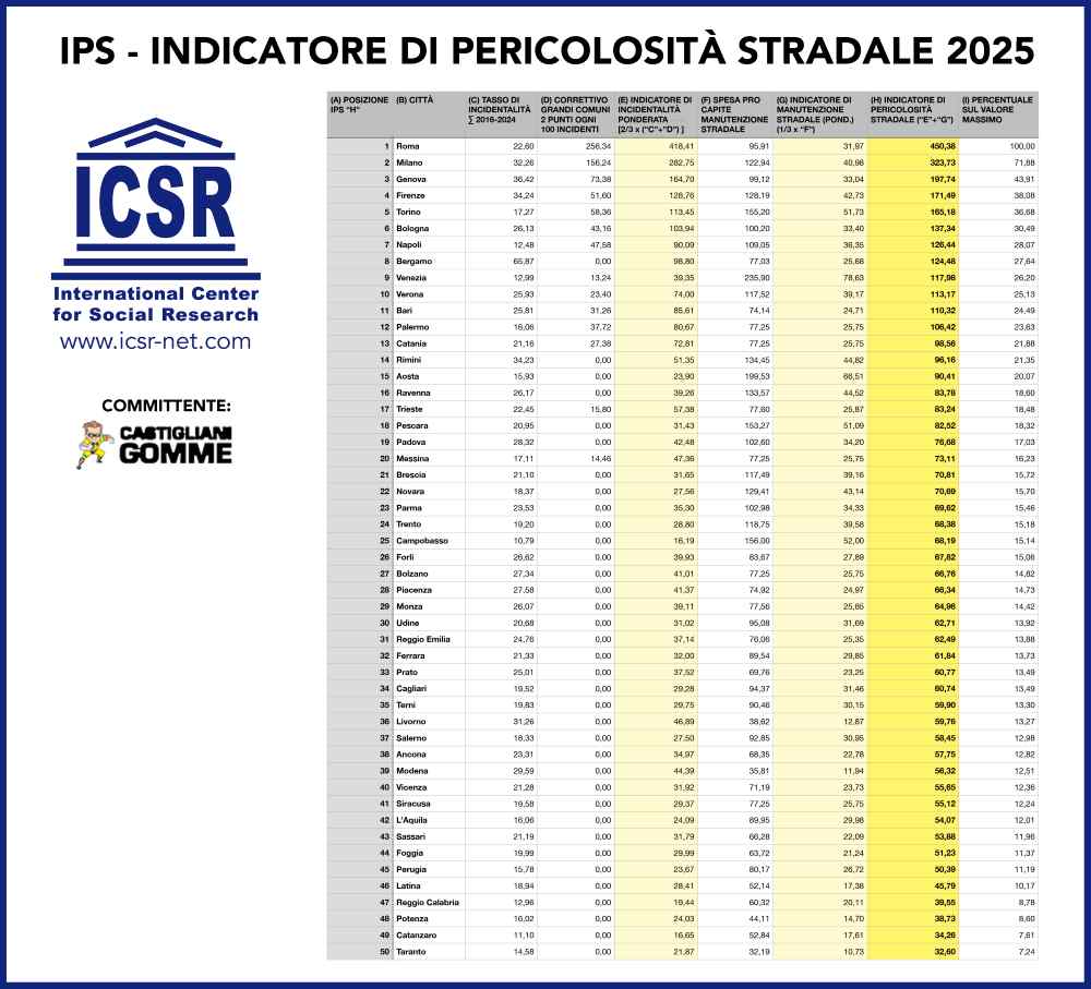 NASCE L’INDICATORE DI PERICOLOSITÀ STRADALE: ROMA (450,38) CONQUISTA IL PRIMO POSTO, SUL PODIO ANCHE MILANO (323,73) E GENOVA (197,74),ECCO LA CLASSIFICA DI CASTIGLIANI GOMME SU 50 CITTÀ ITALIANE