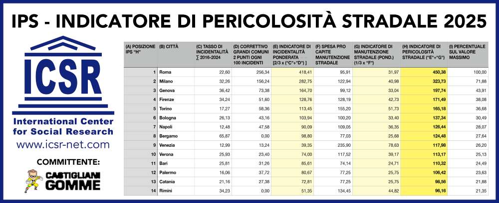 Come poter fare dei paragoni? Alcune città italiane sono particolarmente note per la pessima condizione delle loro strade, ma è molto complicato stabilire con precisione quante sono le buche stradali, così il patron di CastiglianiGomme.it ha chiesto all’International Center for Social Research (IRCS) di costruire un apposito indicatore ed è così nato l’Indicatore di Pericolosità Stradale (IPS).